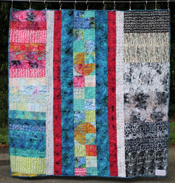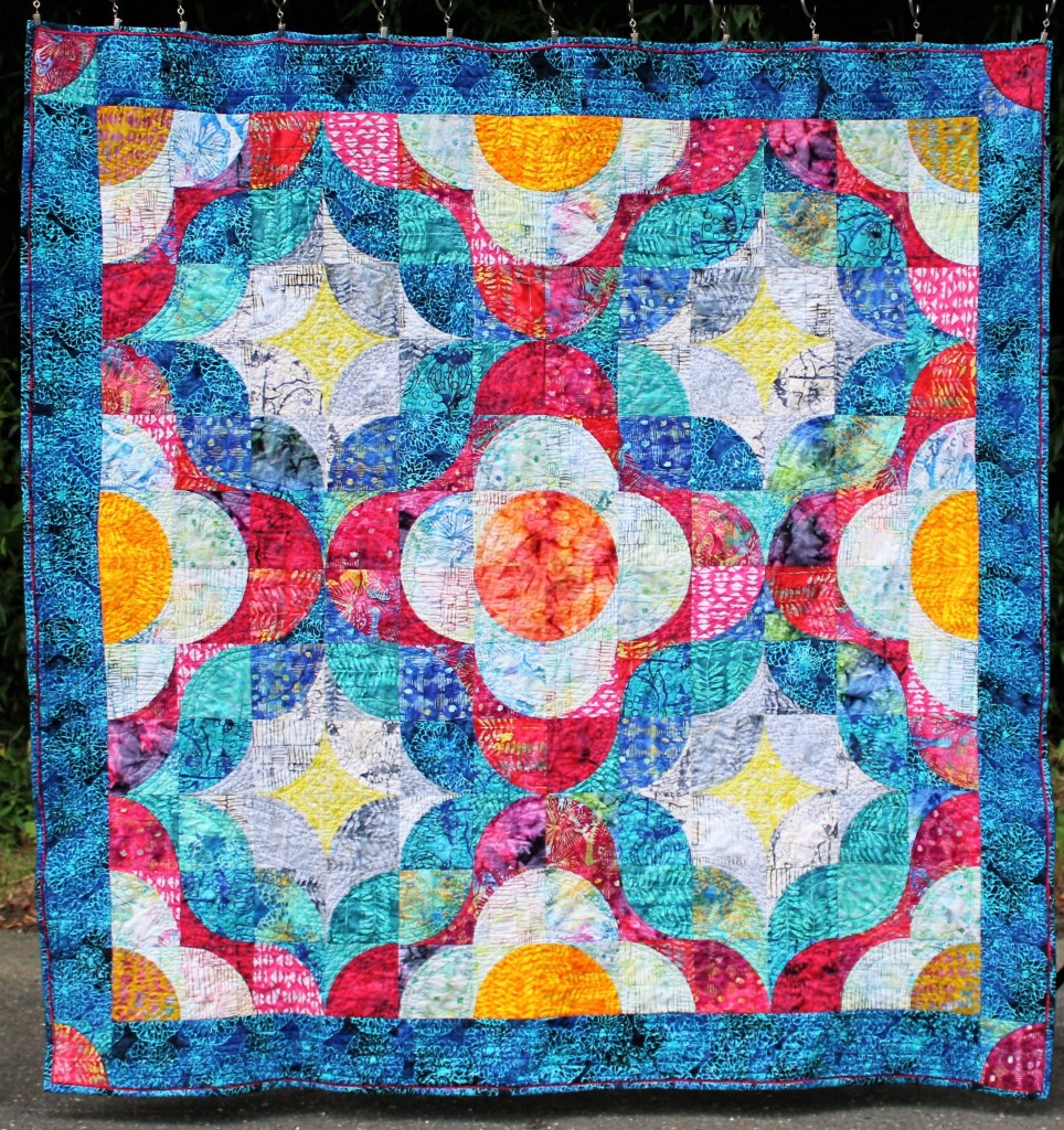 This quilt definitely has a “party in the back”. I ran short of the purple and teal batiks and finished up with similar fabrics from my stash.