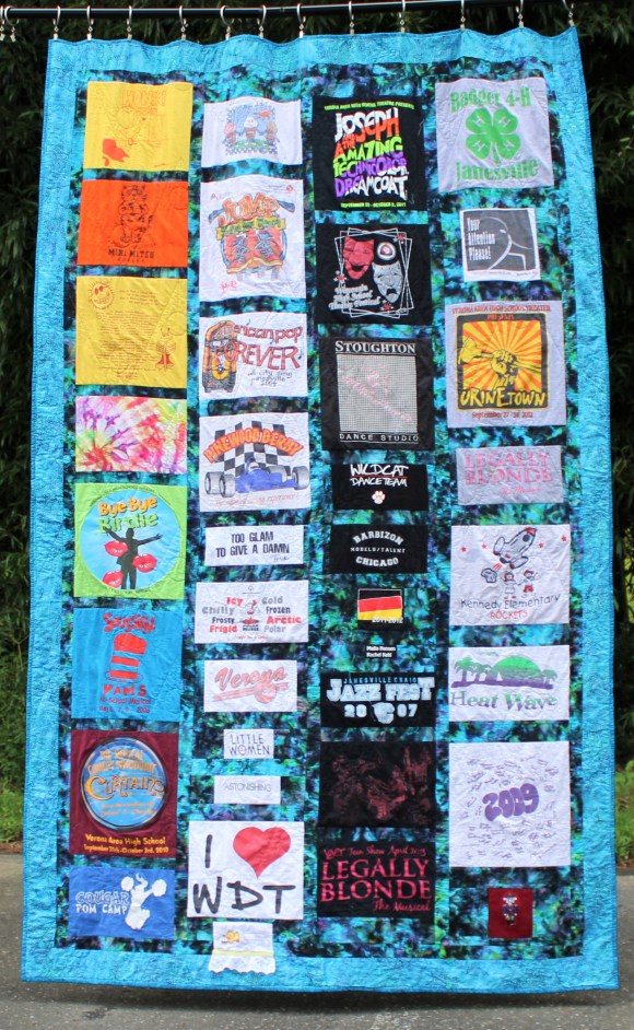 I started collecting T-shirts for all my kids when they were young. I planned to make them each a T-shirt quilt when they graduated from high school. None of them got them as graduation presents, but I am slowly working my way through the box of T-shirts. This one had clear ideas of what she did and did not want in a T-shirt quilt. She selected the batiks and helped me lay out this extra-extra long twin quilt. She also wanted a “fun” back, so it would look good no matter which side was up.