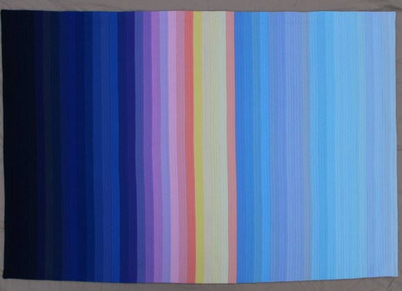 This quilt is very personally meaningful. Changes in the color of the sky from midnight until noon were the inspiration for this quilt. Each strip represents 15 minutes, and each quilting line represents five minutes. The time of nautical, astronomical and civil dawn and of sunrise varies with the time of year and the latitude. I researched the times based on the latitude of Madison, Wisconsin on June 18, 1981, which is where and when my husband and I began our romantic relationship.