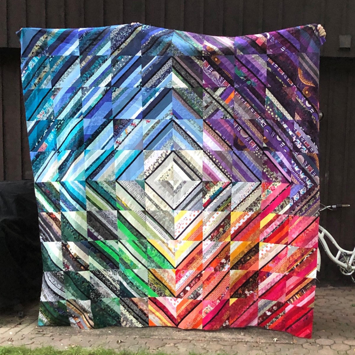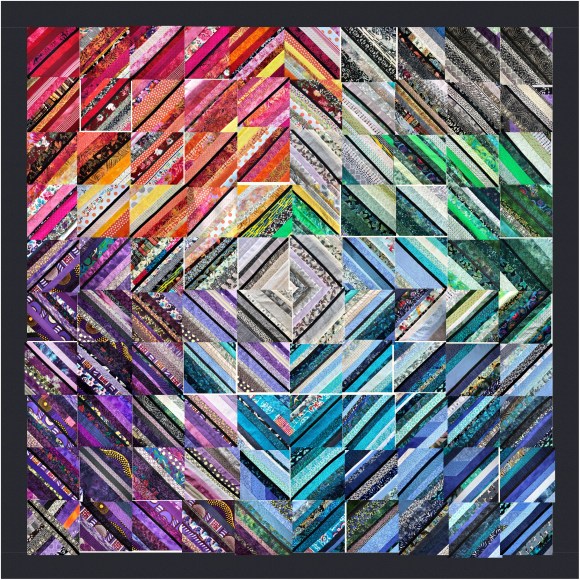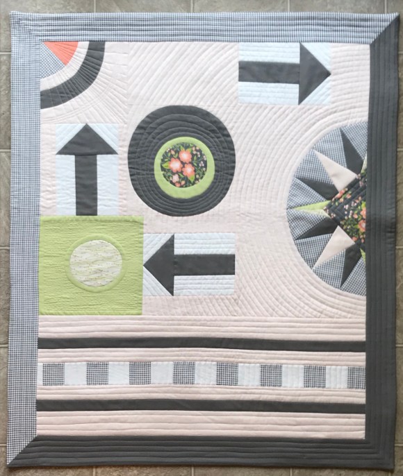 I tried to use the extra pieces I cut in improvisational blocks, but they didn’t work. I set it all aside and worked on a couple of other projects, and put time on my calendar to figure it out. I finally decided to work off of the compass idea and made some arrows and a kind of a road. Here is the final quilt, named “Which Way?”: