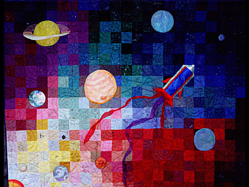 1998-1999 Original design with David Kehl. Pieced background with signatures using Jinny Beyer charms, three-dimensional fabric painted and appliqued planets and rocket.